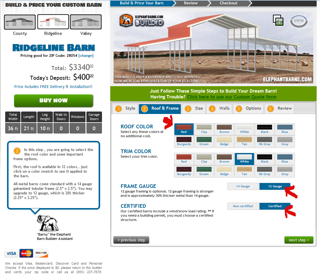 3). In this next step,  you’ll choose the basis of your color scheme! Select one of a dozen color choices for your roof and then choose another for your trimming. Watch your virtual barn update with your choices – pretty cool, right?!  On this page, you’ll also have the option of strengthening your structure by upgrading from 14 gauge steel to thicker 12 gauge steel. Next, you’ll be able to upgrade to a certified structure, which will ensure that it meets or exceeds any states’ building requirements.  Notice that your elephant barns price estimate instantly updates in the top left of the screen as you toggle your preferences on and off. Isn’t that convenient!