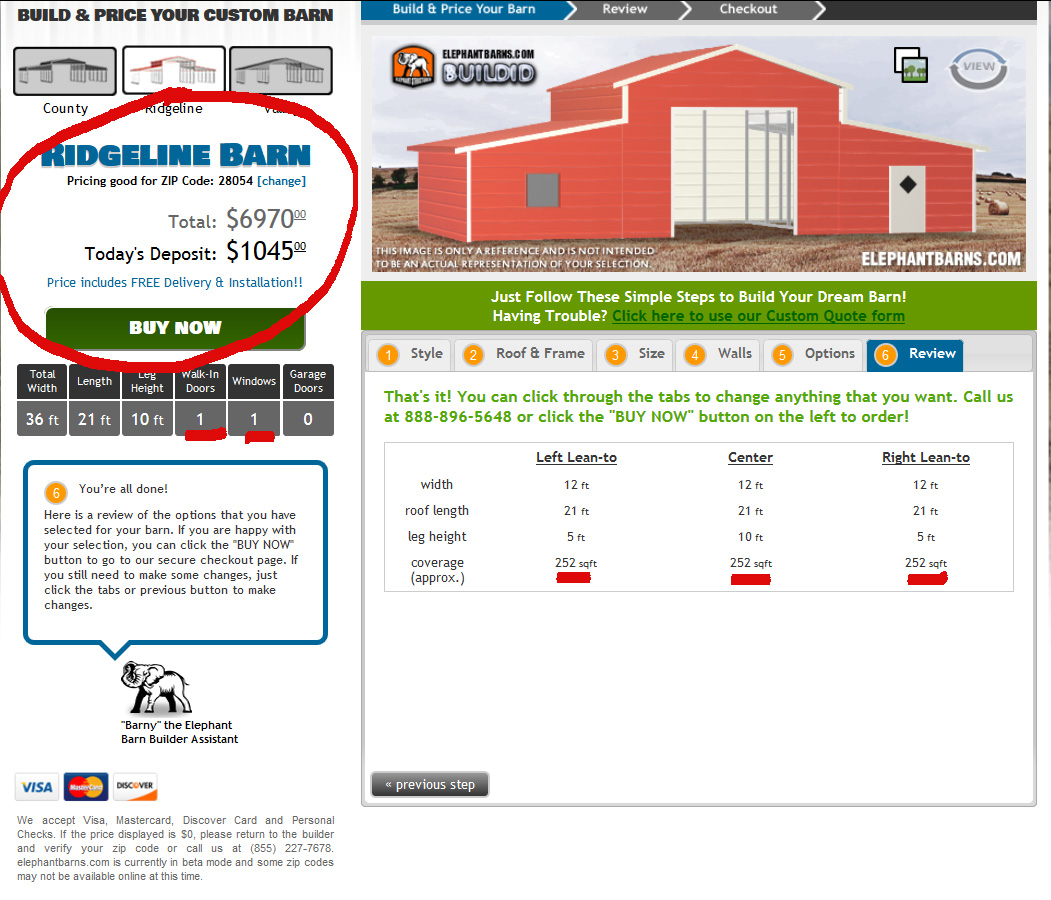 9). Well done! You’re on to the final Review. The dimensions of your barn are laid out clearly before you in the table with the height, length, width, and floor area. If all of your dimensions are satisfactory and the virtual barn you see on screen has all the features you will need, you’re ready to put in your payment information and order! If the price you see in the top right fits your budget and you’re comfortable with the 10% online deposit you’ll pay when you place your order, go ahead and click the “BUY NOW” button! Remember if the price or design doesn’t meet your standards, you can always go back tot he previous steps and customize your order. You have control over what you want to pay, and what you want your barn to look like.